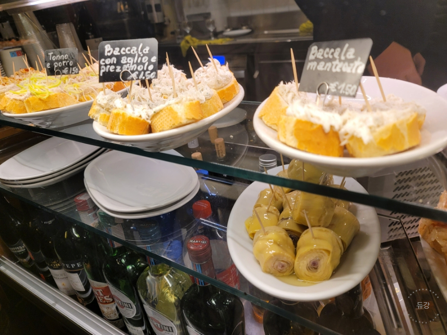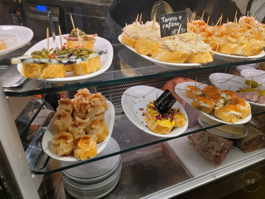 바게트빵위에 야채, 참치, 치즈 등이 올라간 베네치아의 안주거리라고 해요!